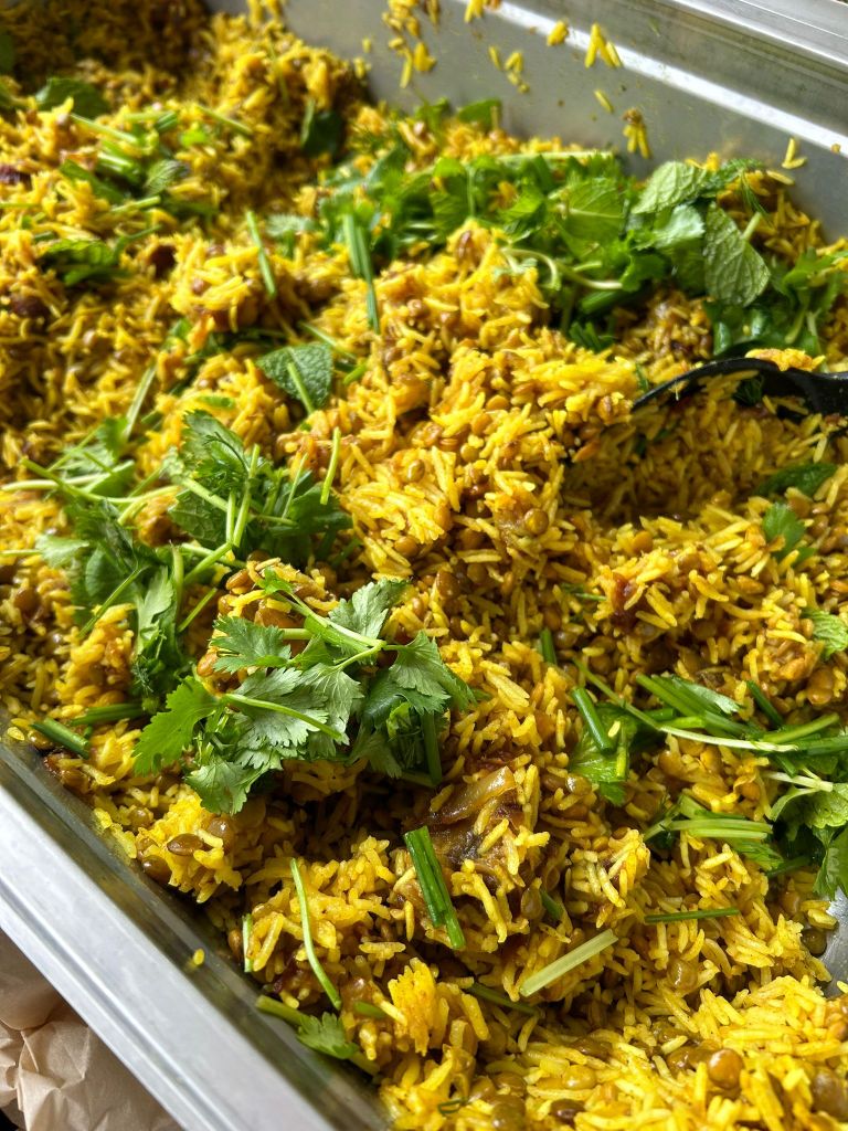 Lentils and rice steamed with warm spices, layered with caramelized onions, garlic, and chopped dates, topped with fresh herbs. This dish is inspired by Persian adas polo. We served it with fresh hummus and lemon juice.