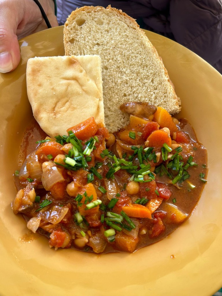 Butternut squash and chickpeas stewed with tomatoes and warm spices. We served it with garden chives, lemon juice, and naan (and leftover bread). Squash and chives fresh from a friend’s garden.