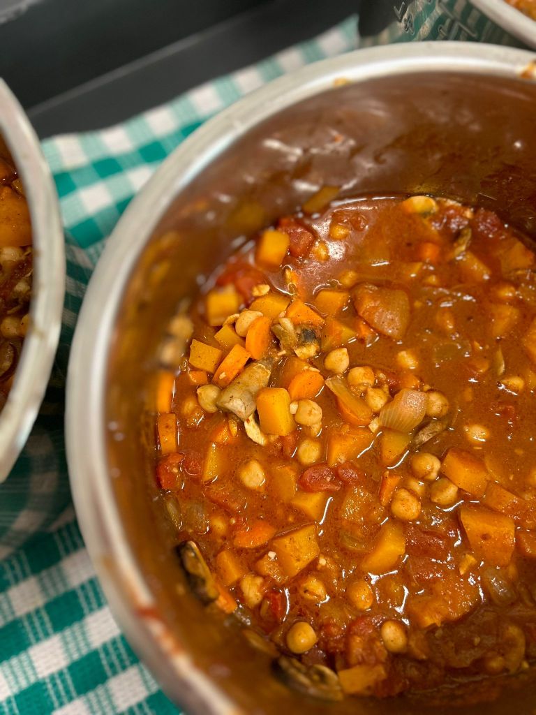- When broth has simmered, add the butternut squash, carrots, and chickpeas.