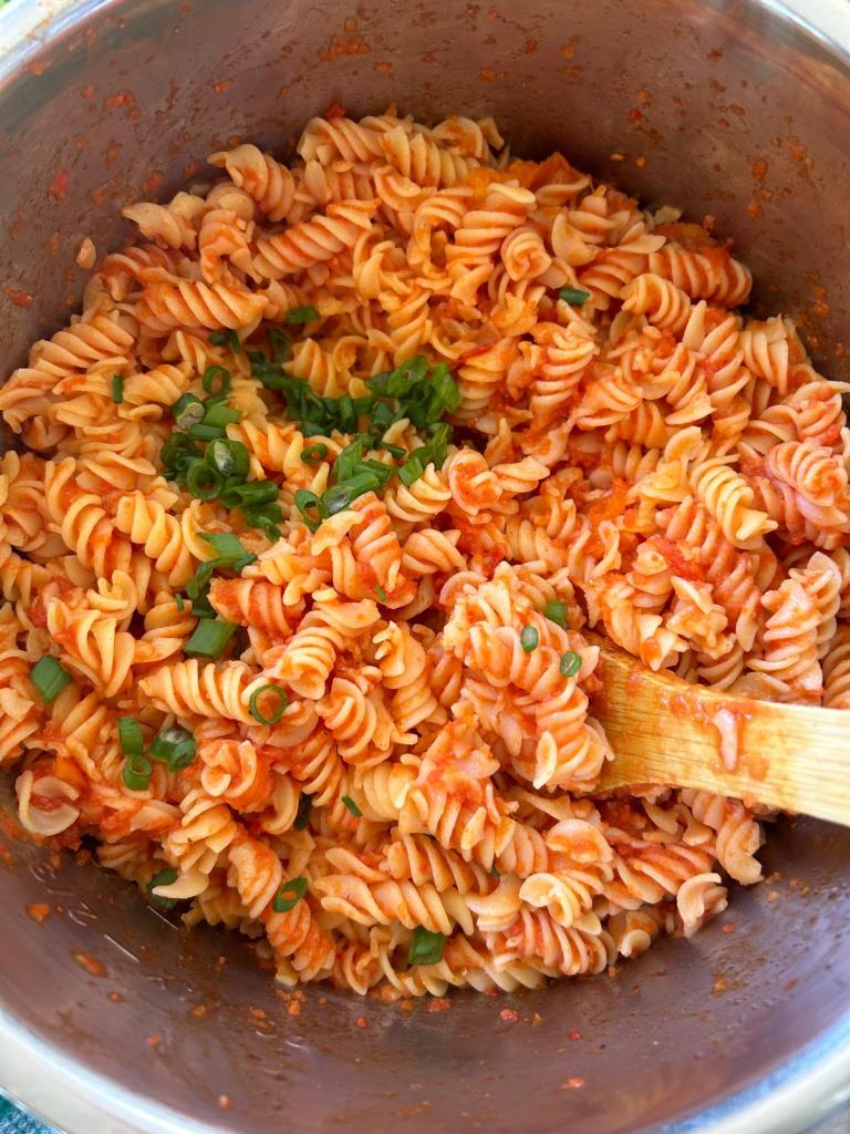 - Stir sauce into pasta and serve with chopped scallions.